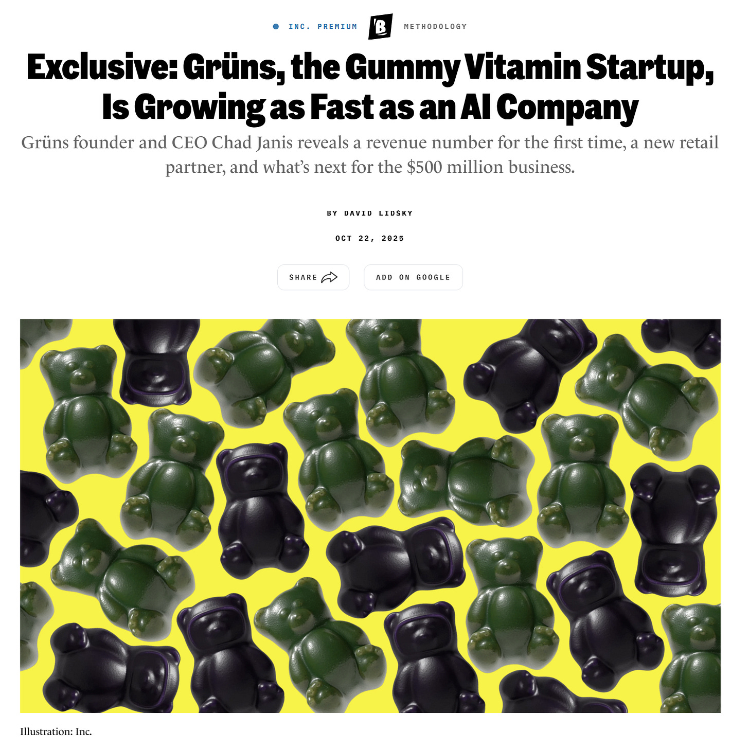 2025년 가을, Inc. 매거진에 소개된 곰돌이 모양 보충제 스타트업 그룬스(Grüns)를 소개하는 글입니다.