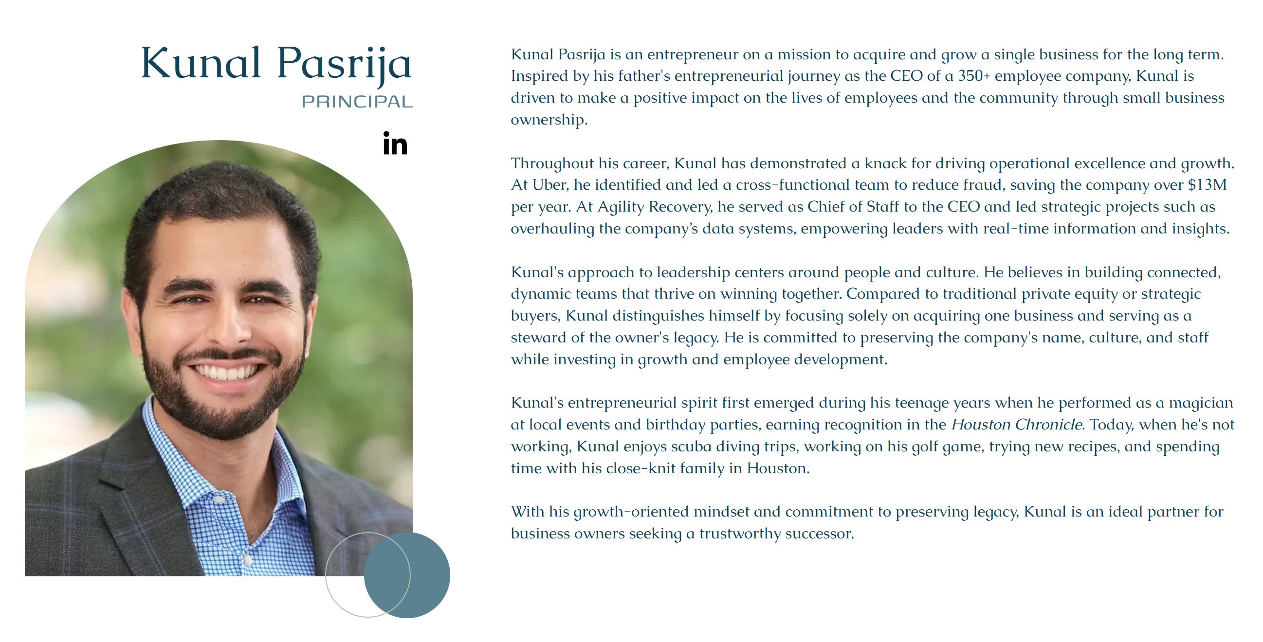 롤모델은 가까이 있었습니다. 아버지 아룬 파스리자(Arun Pasrija)가 직원 350명 규모 기업의 CEO였죠. 어릴 때부터 아버지가 사업을 키워가는 과정을 지켜보며 자란 Kunal은 “나도 언젠가 기업을 경영하고 싶다”는 생각을 줄곧 해왔습니다. 하지만 이미 빅테크 시스템을 경험한 입장에서는 ‘처음부터 회사를 만드는 것’보다 ‘이미 검증된 사업을 인수해서 더 키우는 것’에 끌렸어요.