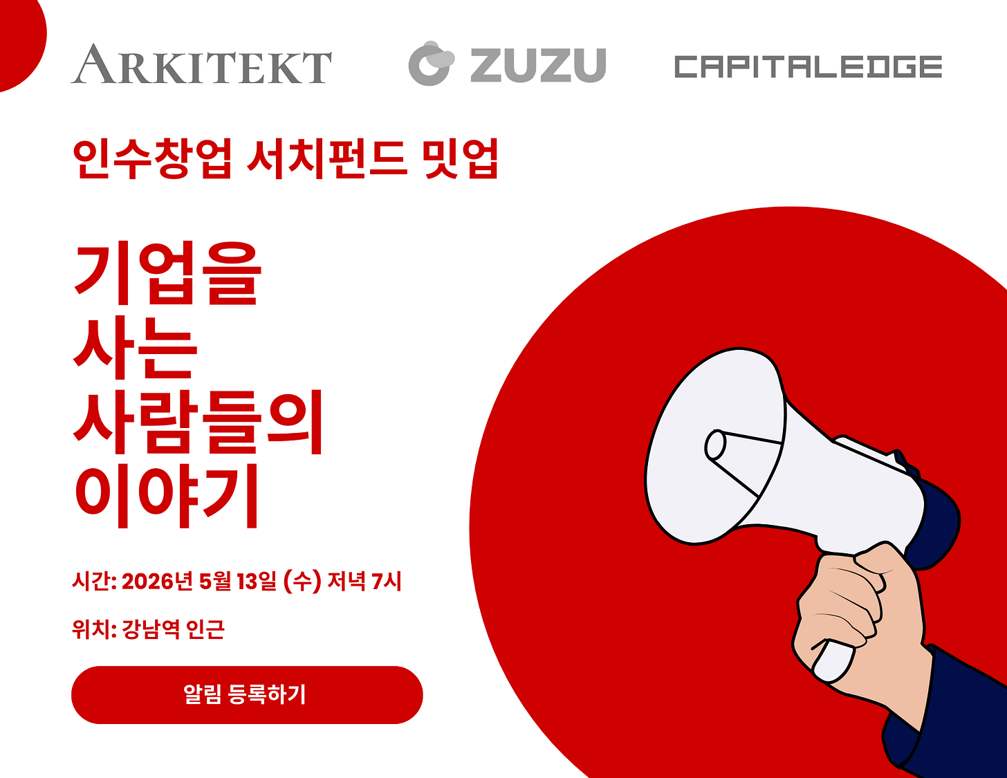 오는 5월, 서치펀드와 인수창업에 관심 있는 분들을 위한 첫 오프라인 밋업이 열립니다. 비슷한 고민을 가진 사람들, 실제로 인수를 검토 중인 사람들, 이 생태계에 투자자로 참여하고 싶은 분들이 모여 솔직한 대화를 나누는 자리입니다.