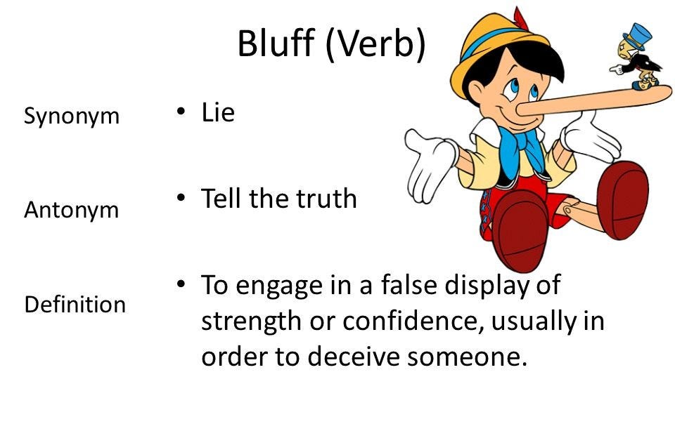 블러핑(bluffing)은 그래도 결이 조금 다릅니다. “실제보다 강한 척, 가진 척, 할 수 있는 척을 연출하여 상대의 반응을 유도하는 행위”에 가깝습니다. 웹스터 사전에 따르면 블러프(bluff)는 “허세나 힘의 과시로 겁주거나 저지하는 것”, 나아가 “약한 패로 강한 배팅을 해 상대를 속이는 것”이란 의미를 함께 담고 있습니다.