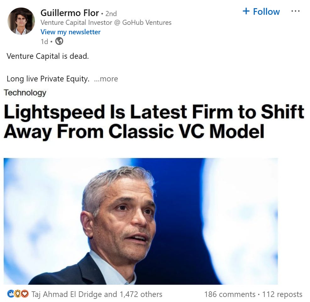 전형적인 AI 요약 기사와 바이럴만이 중요한 정보 전달 시대의 폐해입니다. 블룸버그의 원문 기사가 최근 벤처캐피탈 업계에서 RIA 전환, 세컨더리 투자, 공모시장 진입 등 다양한 전략적 변화가 감지되고 있다는 점을 조명하긴 했지만 AI 요약 기반으로 재구성된 콘텐츠들은 아무런 컨텍스트없이 ‘벤처캐피탈 모델의 종말’이라는 자극적인 워딩만 바이럴되고 재공유된 것입니다. AI 시대 컨텐츠 유통의 한 단면입니다.