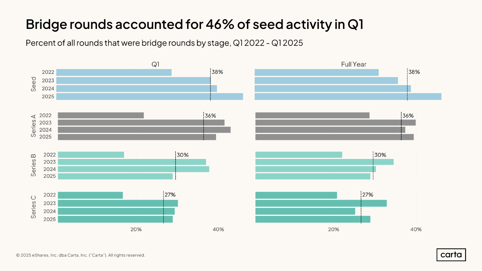 시리즈 A 자금 조달의 어려움이 원인 - 시리즈 A 거래 건수가 2022년 1분기 대비 2025년 1분기에 79% 감소해 더 많은 시드 단계 스타트업이 생존을 위한 브릿지 라운드를 선택함.