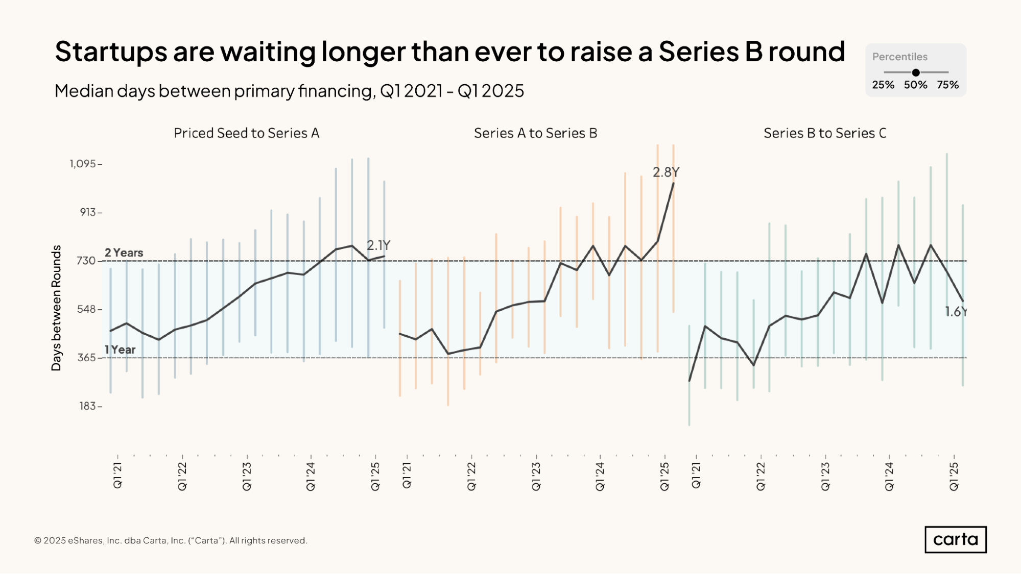 시리즈 B까지의 대기 시간 역대 최장 기록 - 2025년 1분기에 시리즈 B를 유치한 스타트업들은 시리즈 A 이후 중앙값 2.8년을 기다렸으며, 이는 기록상 가장 긴 간격임.
