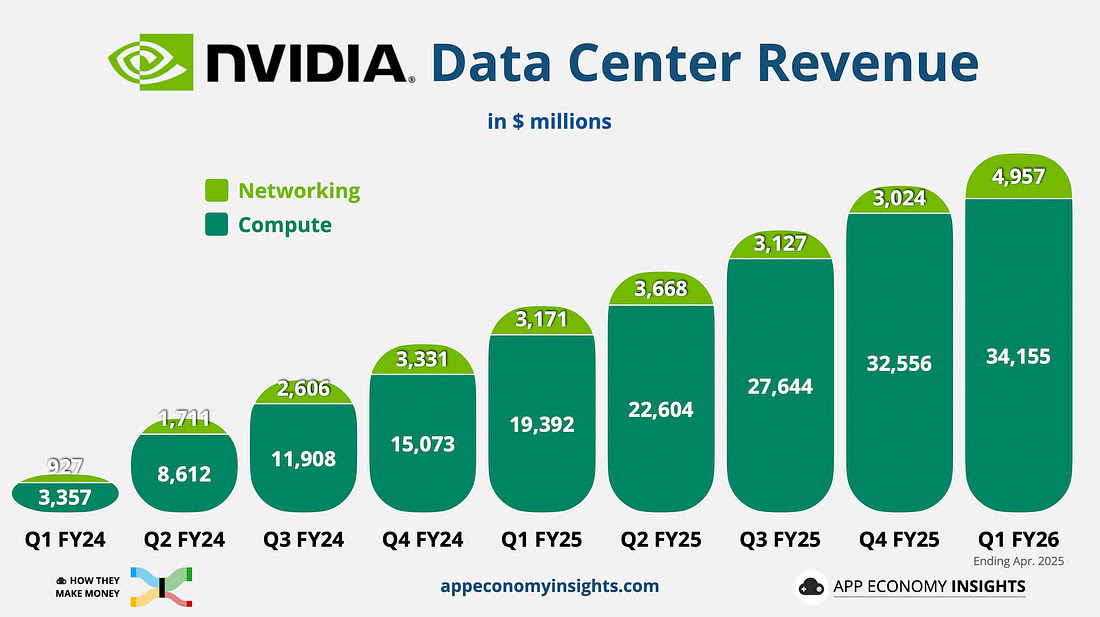 네트워킹: NVLink와 이더넷 AI 배치에 의해 견인되는 지속적인 강력한 성장세를 보임. 이는 엔비디아의 통합 시스템 전략에서 핵심적인 부분임.