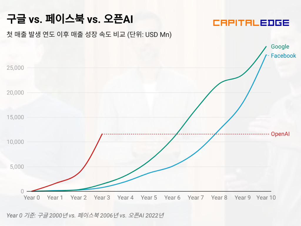기술과 제품의 빠른 확산과 성장은 테크 기업의 프리미엄을 정당화하는 가장 강력한 근거입니다. 또한 새로운 카테고리를 개척하는 선도 기업은 투자자들의 예상을 뛰어넘는 성장세를 보이며 매 투자 라운드마다 더 높은 프리미엄을 인정받는 경향이 있습니다. 2023년 5월 WeeklyEDGE에서 다루었던 오픈AI 기업가치 390억 달러 분석 당시 예상했던 2024년 매출은 10억 달러였습니다. 하지만 실제 오픈AI의 2024년 매출은 35억 달러를 넘어선 것으로 추정됩니다.