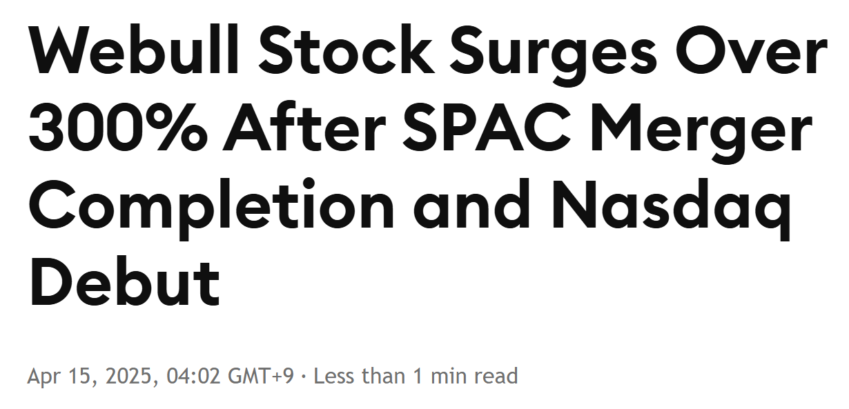 그러나 이런 혼돈 속에서도 흥미로운 현상이 나타나고 있습니다. 2021년의 붐 이후 사실상 사라졌던 스팩 합병 상장이 재등장하고 있는 것입니다. 지난주, 온라인 증권 플랫폼 위불(Webull)은 SK그룹의 스팩과 합병해 나스닥 상장에 성공했고, 첫 거래일 주가가 375% 급등하며 시가총액이 290억 달러를 돌파했습니다.
