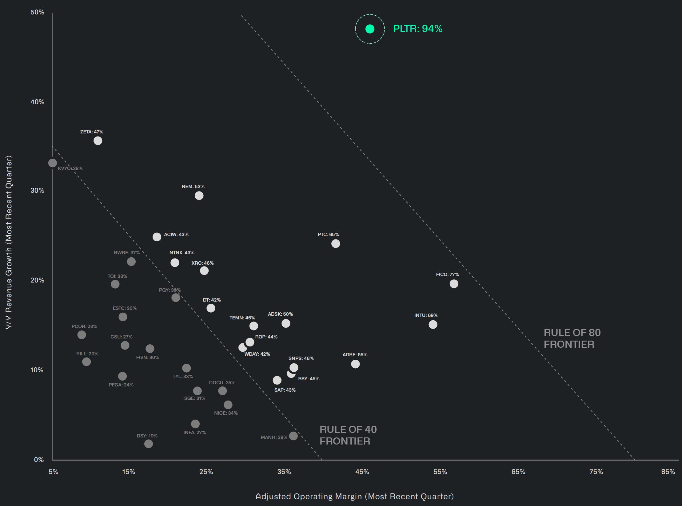 팔란티어가 2025년 2분기 실적 발표를 하며 가장 먼저 내세운 지표가 하나 있습니다. 바로 Rule of 40라는 지표입니다. 실리콘밸리 소프트웨어 투자 업계에서 주로 통용되던 전문 용어에 가까운 Rule of 40는 회사의 성장성과 수익성을 하나의 지표로 평가하는 지표입니다. 해당 지표가 40을 넘어서면 준수한 성과라는 기준으로 여겨지기 때문에 '40의 법칙'이라고 불리는 것입니다. 보통 지표가 뛰어난 기업들은 해당 기준인 40을 얼마나 넘어서느냐를 가지고 투자자들을 설득하기도 합니다.